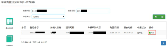 需要打印預(yù)申報(bào)表的,在進(jìn)入車輛購置稅預(yù)申報(bào)(4S店專用)頁面后,輸入發(fā)票代碼和發(fā)票號碼,選擇申報(bào)狀態(tài):已申報(bào)。查詢。