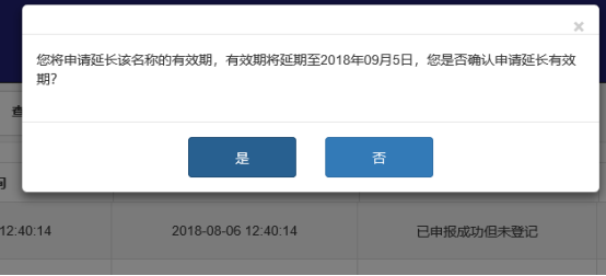 ③“延長有效期”按鍵:申請人點擊該按鍵,窗口出現“您將申請延長該名稱的有效期,有效期將延期至XXXX年XX月XX日,您是否確認申請延長有效期?”的提示信息,同時出現“是”和“否”兩個按鍵。