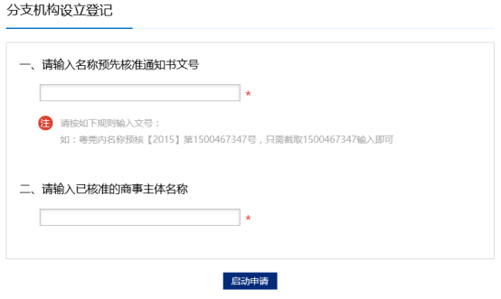 填寫已通過的名稱預(yù)先核準(zhǔn)通知書文號和已核準(zhǔn)的商事主體名稱啟動申請。