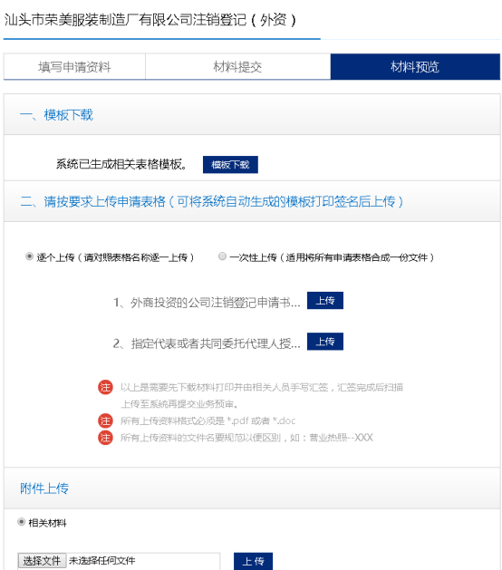 可點擊生成并下載PDF文件,打印后由申請人在相應(yīng)的材料上手寫簽名并掃描上傳至系統(tǒng),或者將申請人按照工商部門規(guī)定提前準備好的申請材料掃描上傳至系統(tǒng)。
