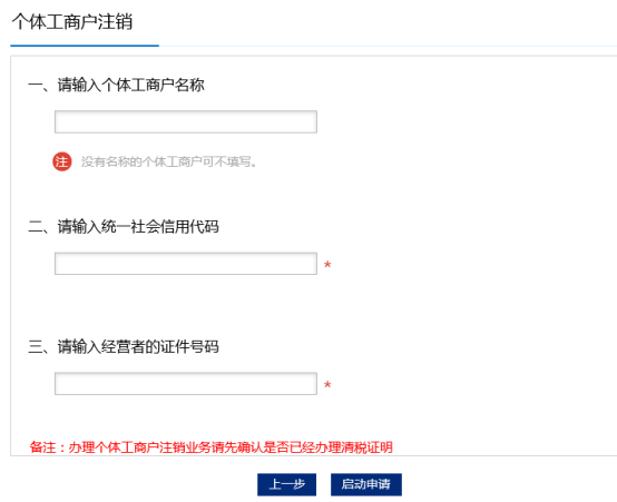 輸入工商統(tǒng)一信用代碼/注冊(cè)號(hào)、個(gè)體工商戶名稱、經(jīng)營(yíng)者證件號(hào)碼才可啟動(dòng)個(gè)體工商戶的變更。