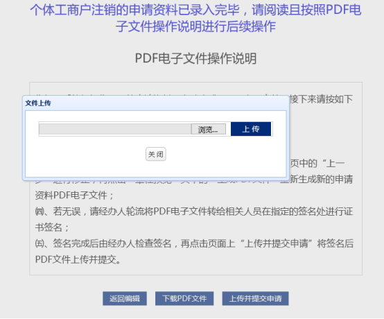 可點(diǎn)擊生成并下載PDF文件,打印后由申請(qǐng)人在相應(yīng)的材料上手寫簽名并掃描上傳至系統(tǒng),或者將申請(qǐng)人按照工商部門規(guī)定提前準(zhǔn)備好的申請(qǐng)材料掃描上傳至系統(tǒng)。