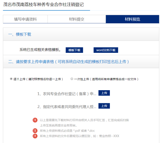 可點擊生成并下載PDF文件,打印后由申請人在相應(yīng)的材料上手寫簽名并掃描上傳至系統(tǒng),或者將申請人按照工商部門規(guī)定提前準備好的申請材料掃描上傳至系統(tǒng)。