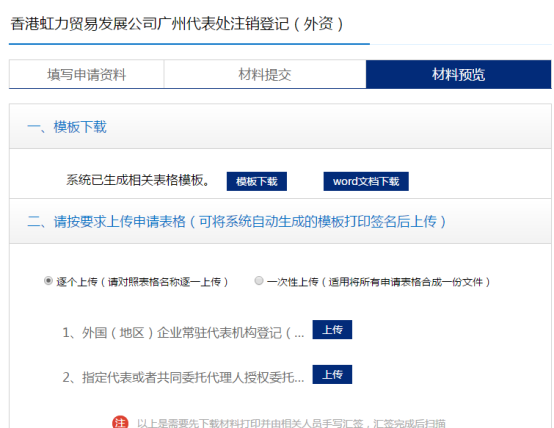 可點(diǎn)擊生成并下載PDF文件,打印后由申請人在相應(yīng)的材料上手寫簽名并掃描上傳至系統(tǒng),或者將申請人按照工商部門規(guī)定提前準(zhǔn)備好的申請材料掃描上傳至系統(tǒng)。