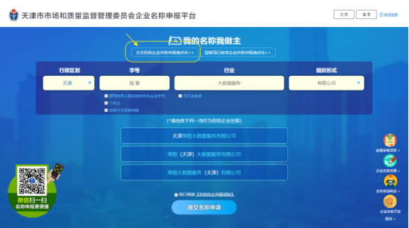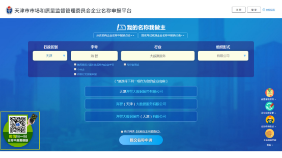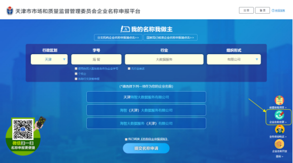 通過關(guān)注“天津企業(yè)登記”公眾號或PC端左下角“微信掃一掃”(如下圖,黃色標(biāo)記所示),點(diǎn)擊“我要辦理”,選擇“名稱申報“即可。
