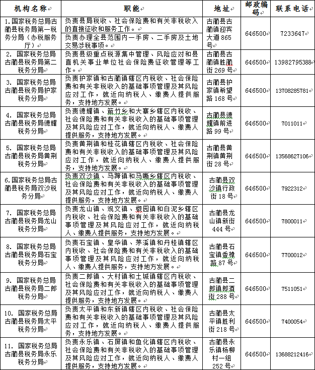 根據(jù)國稅地稅征管體制改革工作部署,國家稅務總局古藺縣稅務局于2018年7月20日正式掛牌。為確保稅務機構改革后各項稅收工作平穩(wěn)有序運行,現(xiàn)就國家稅務總局古藺縣稅務局有關稅收事項公告如下: 。。。