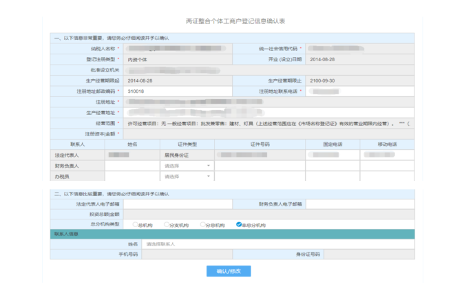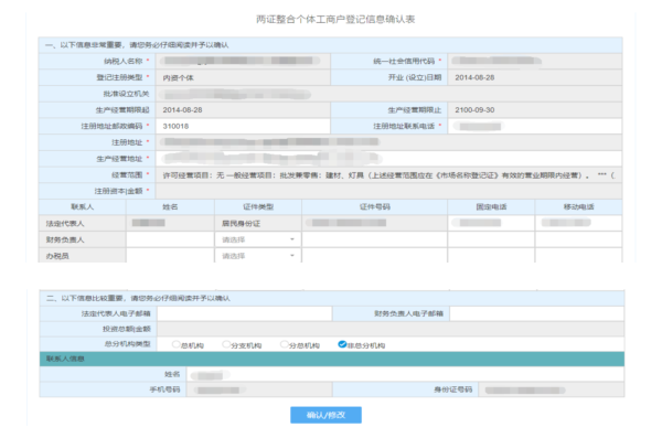 納稅人可以通過本功能對兩證整合的個體工商戶相關(guān)登記信息進行核實確認。