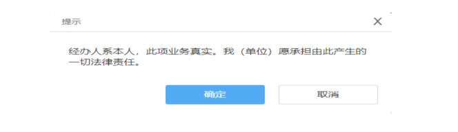 確認(rèn)無誤后,點(diǎn)擊【提交】按鈕,系統(tǒng)跳出確認(rèn)窗口“經(jīng)辦人系本人,此項(xiàng)業(yè)務(wù)真實(shí)。我(單位)愿承擔(dān)由此產(chǎn)生的一切法律責(zé)任?!?/span>