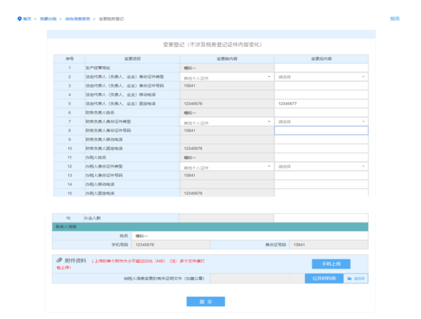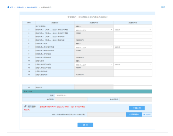 納稅人基本信息系統(tǒng)會(huì)自動(dòng)取數(shù)賦值,無需納稅人進(jìn)行填寫,納稅人只需要根據(jù)企業(yè)實(shí)際情況,在“變更后內(nèi)容”項(xiàng)中填入信息,選擇“聯(lián)系人信息”,并上傳附列資料信息。
