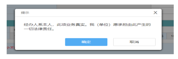 確認(rèn)無誤后,點(diǎn)擊【提交】按鈕,系統(tǒng)跳出確認(rèn)窗口“經(jīng)辦人系本人,此項(xiàng)業(yè)務(wù)真實(shí)。我(單位)愿承擔(dān)由此產(chǎn)生的一切法律責(zé)任。”