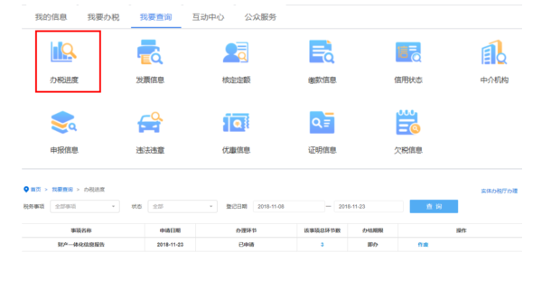 可通過【我要查詢】——【辦稅進(jìn)度】模塊,查詢已提交辦稅事項受理進(jìn)度。