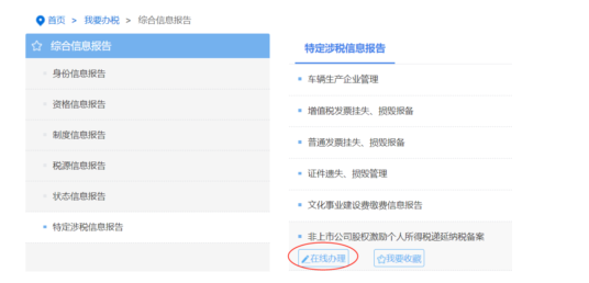 我要辦稅→綜合信息報告→特定涉稅信息報告→非上市公司股權(quán)激勵個人所得稅遞延納稅備案