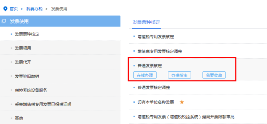 登錄路徑:【我要辦稅】—【發(fā)票使用】—【發(fā)票票種核定】—【普通發(fā)票核定】—【在線辦理】