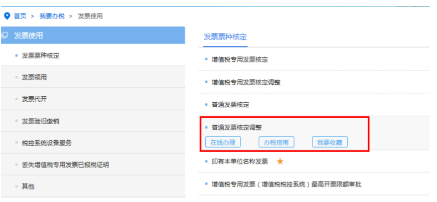 登錄路徑:【我要辦稅】—【發(fā)票使用】—【發(fā)票票種核定】—【普通發(fā)票核定調(diào)整】—【在線辦理】