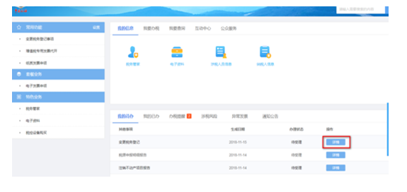 可點(diǎn)擊“查看我的申請(qǐng)資料”查看剛才填寫的表單信息,可點(diǎn)擊“撤銷申請(qǐng)”撤銷變更稅務(wù)登記事項(xiàng)申請(qǐng)。