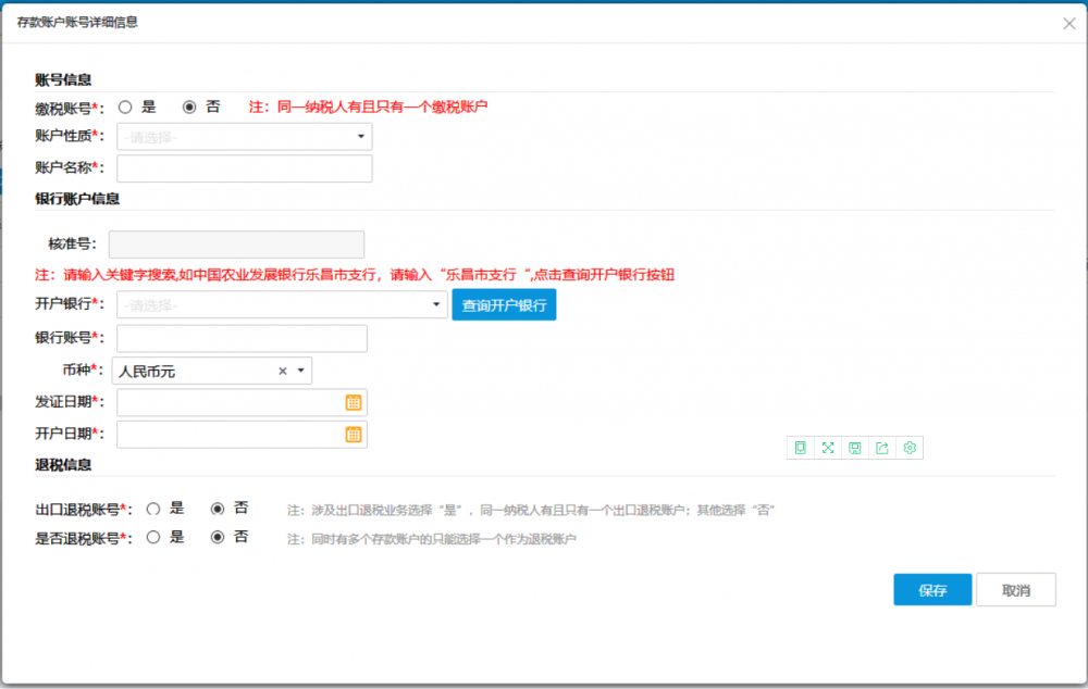 10、出口退稅賬號:涉及出口退稅業(yè)務(wù)選擇“是”,同一納稅人有且只有一個出口退稅賬戶;其他選擇“否”。