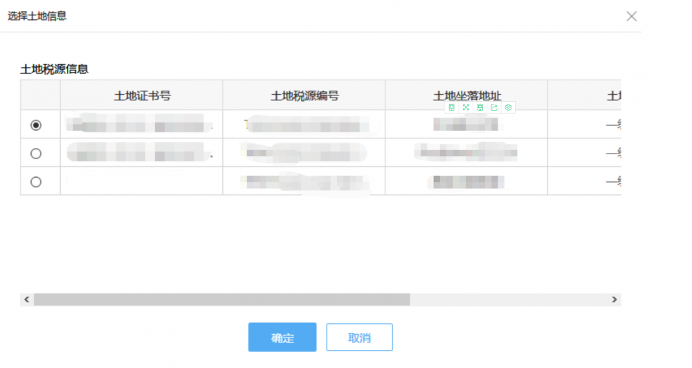 選擇“出轉(zhuǎn)讓方式”后,系統(tǒng)會(huì)彈出“選擇土地信息”窗口,選擇一條記錄后,點(diǎn)擊【確定】按鈕。