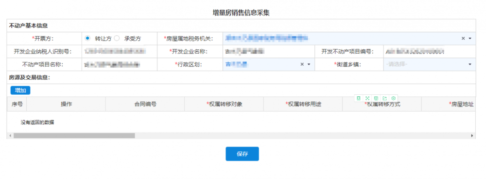 業(yè)務(wù)描述:房地產(chǎn)開發(fā)商進(jìn)行項(xiàng)目稅收申報(bào)時(shí),應(yīng)當(dāng)按照有關(guān)規(guī)定報(bào)送房屋銷售合同和《增量房銷售信息表》,系統(tǒng)采集相關(guān)報(bào)送信息后,產(chǎn)生房源編號(hào),同時(shí)記錄與不動(dòng)產(chǎn)項(xiàng)目編號(hào)關(guān)聯(lián)關(guān)系;納稅人已銷售房產(chǎn)發(fā)生退回的,當(dāng)期應(yīng)收款欄目以負(fù)數(shù)形式體現(xiàn)。