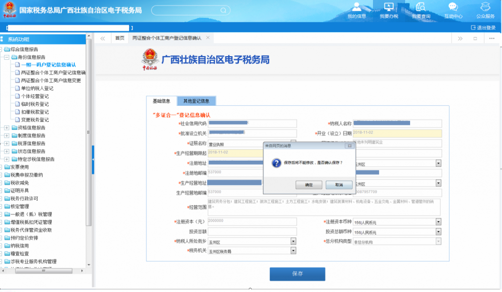 填寫(xiě)表單,點(diǎn)擊【保存】按鈕,待頁(yè)面彈出提示框提示“保存后將不能修改,是否確認(rèn)保存?”