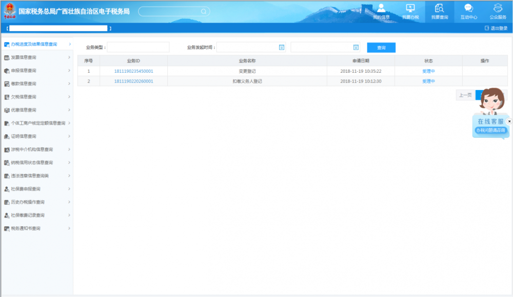 業(yè)務(wù)提交后,可通過右上角【我要查詢—辦稅進度及結(jié)果信息查詢】,查看該業(yè)務(wù)辦理進度及業(yè)務(wù)狀態(tài):