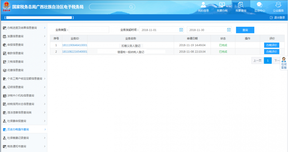 業(yè)務辦結后,可通過右上角【我要查詢—歷史辦稅操作查詢】,查看企業(yè)已經(jīng)辦理完成的業(yè)務(即狀態(tài)為已完成、已作廢的業(yè)務),如下: