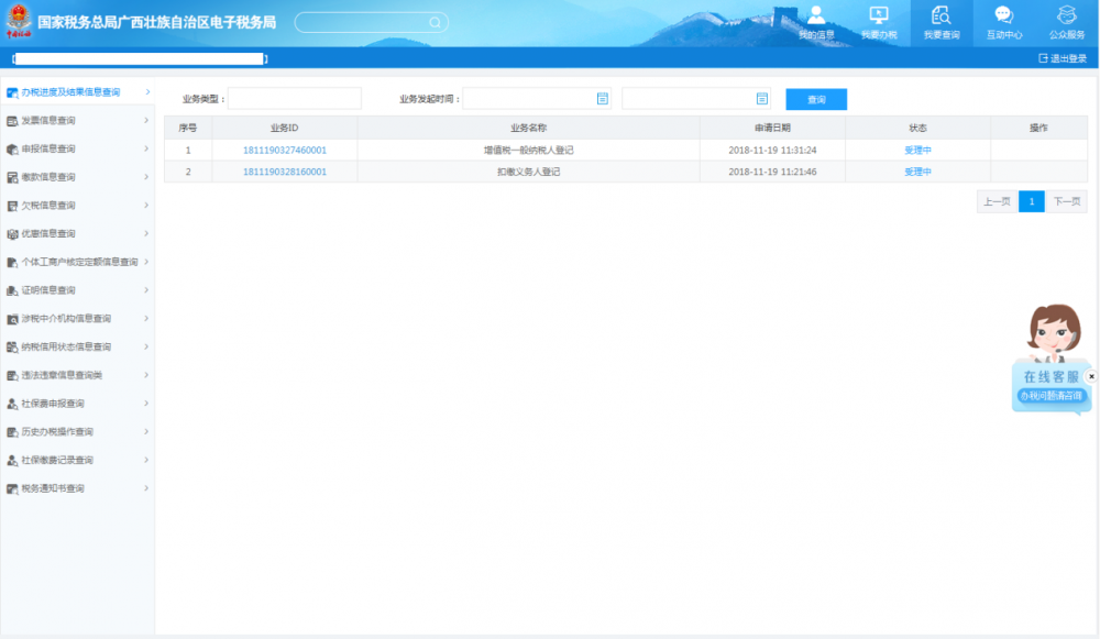 業(yè)務提交后,可通過右上角【我要查詢—辦稅進度及結果信息查詢】,查看該業(yè)務辦理進度及業(yè)務狀態(tài):