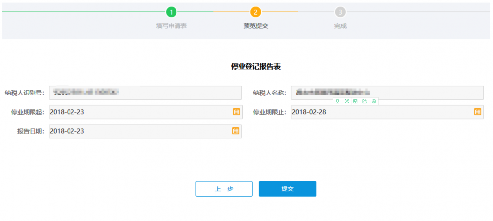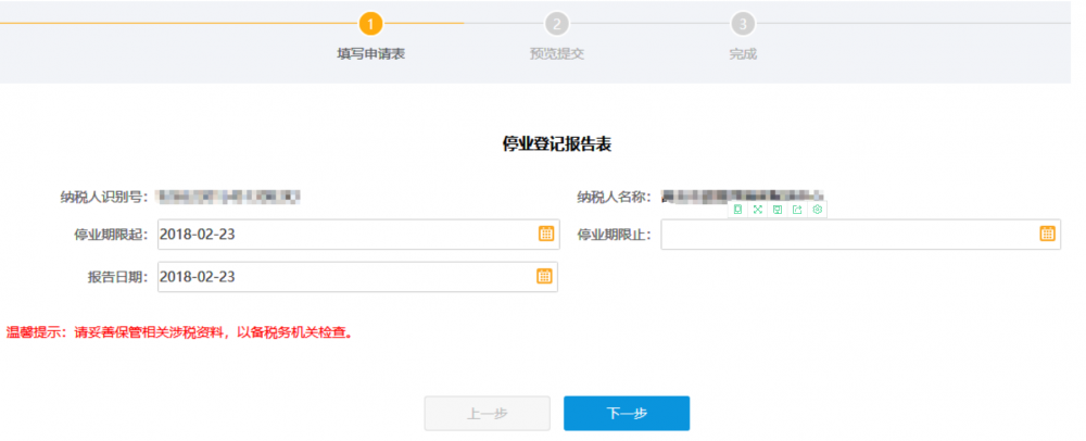 “停業(yè)期限起”系統(tǒng)使用當前日期進行填充,您可以進行修改。錄入后點擊【下一步】按鈕。