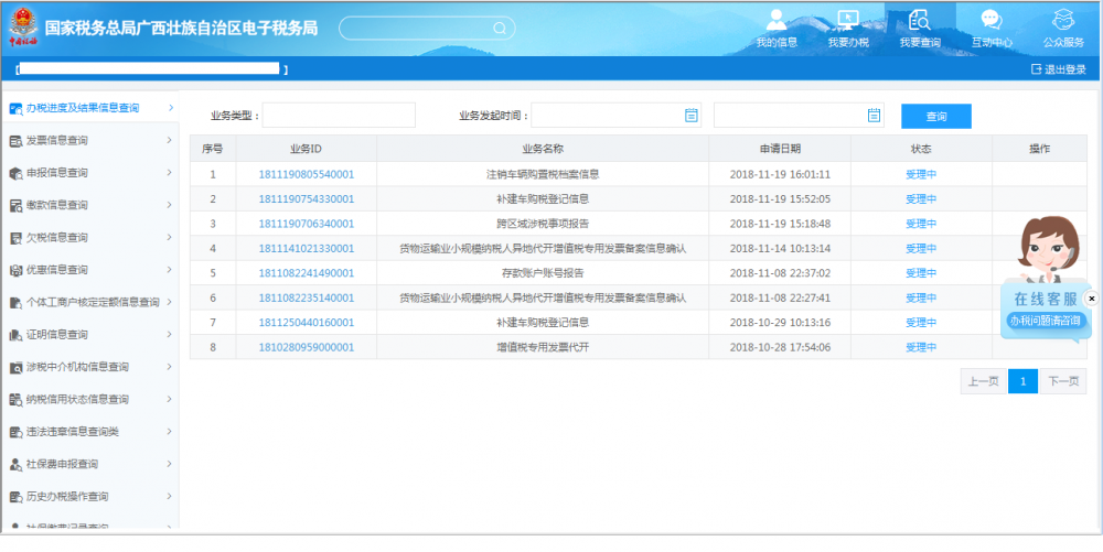 業(yè)務(wù)提交后,可通過(guò)右上角【我要查詢(xún)—辦稅進(jìn)度及結(jié)果信息查詢(xún)】,查看該業(yè)務(wù)辦理進(jìn)度及業(yè)務(wù)狀態(tài):