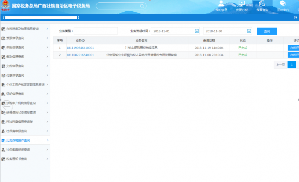 業(yè)務(wù)辦結(jié)后,可通過(guò)右上角【我要查詢(xún)—?dú)v史辦稅操作查詢(xún)】,查看企業(yè)已經(jīng)辦理完成的業(yè)務(wù)(即狀態(tài)為已完成、已作廢的業(yè)務(wù)),如下: