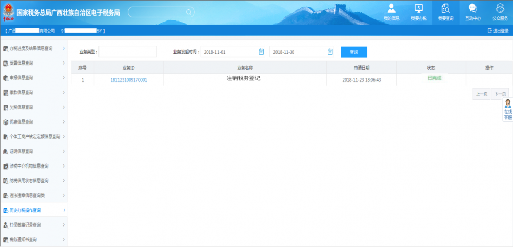 業(yè)務(wù)辦結(jié)后,可通過右上角【我要查詢—?dú)v史辦稅操作查詢】,查看企業(yè)已經(jīng)辦理完成的業(yè)務(wù)(即狀態(tài)為已完成、已作廢的業(yè)務(wù)),如下: