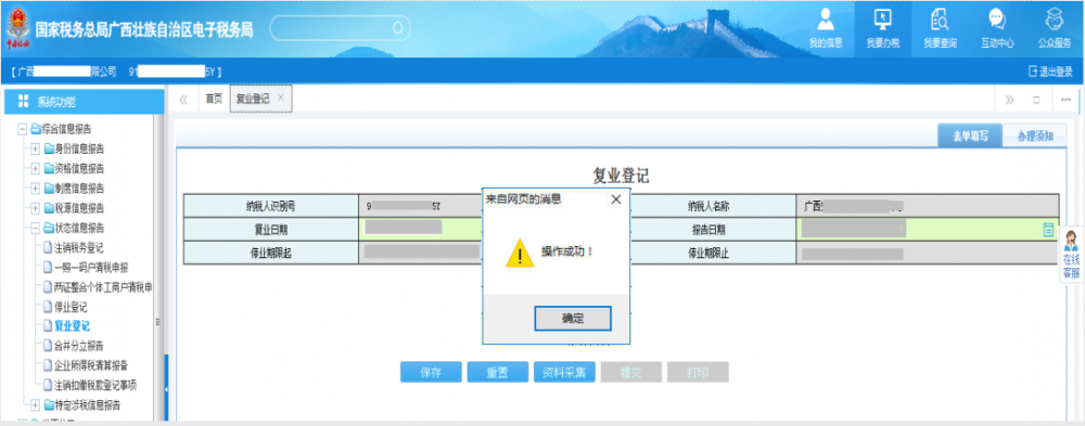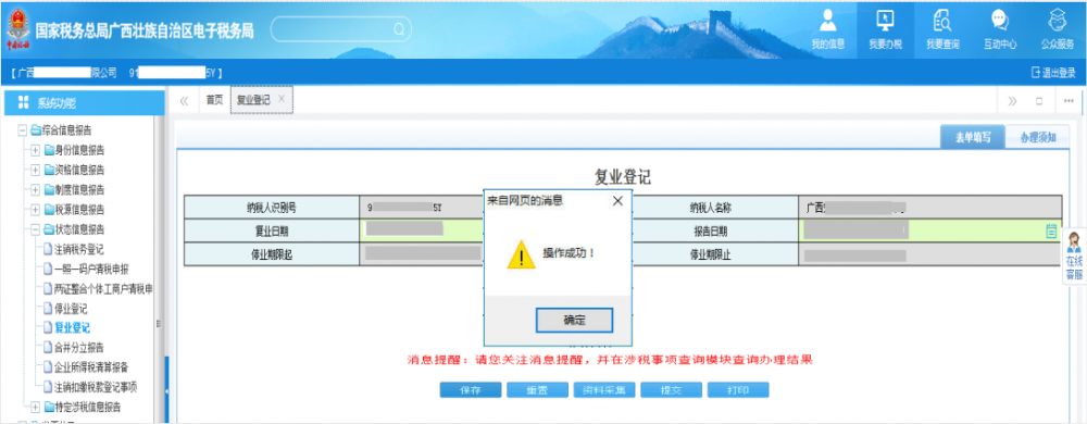 待頁面提示“操作成功”后,點擊【確定】,頁面跳轉(zhuǎn)至辦稅進(jìn)度及結(jié)果信息查詢。