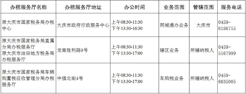 大慶市稅務局各(區(qū))縣辦稅服務廳辦公時間地址及納稅服務電話