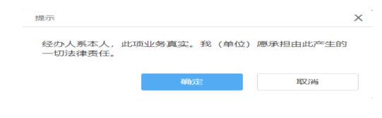確認(rèn)無誤后,點擊【提交】按鈕,系統(tǒng)跳出確認(rèn)窗口“經(jīng)辦人系本人,此項業(yè)務(wù)真實。我(單位)愿承擔(dān)由此產(chǎn)生的一切法律責(zé)任?!?