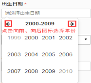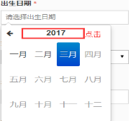 4 系統(tǒng)中的日期項只能通過在時間控件上點選的方式獲取值,不支持手工錄入方式。例如,填寫“出生日期”,鼠標(biāo)先點擊“出生日期”文本框,彈出時間控件;然后按照下圖所示步驟來選擇日期。