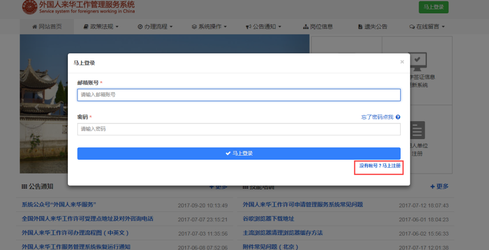 如果登記人沒(méi)有擁有“持R字簽證信息更新系統(tǒng)”的郵箱賬號(hào)和密碼,可點(diǎn)擊登錄頁(yè)面的“沒(méi)有賬號(hào)?馬上注冊(cè)”鏈接注冊(cè)登記賬號(hào)。