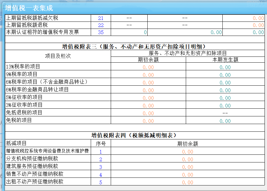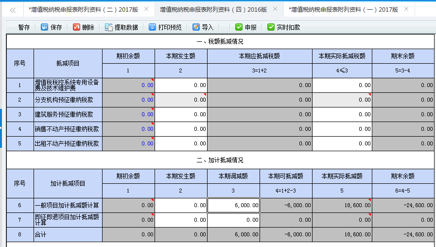 4、增值稅納稅申報表附列資料(四)》增加了“稅額抵減情況”、“加計抵減情況”、“一般項目加計抵減額計算”、“即征即退項目加計抵減額計算”、“合計”。