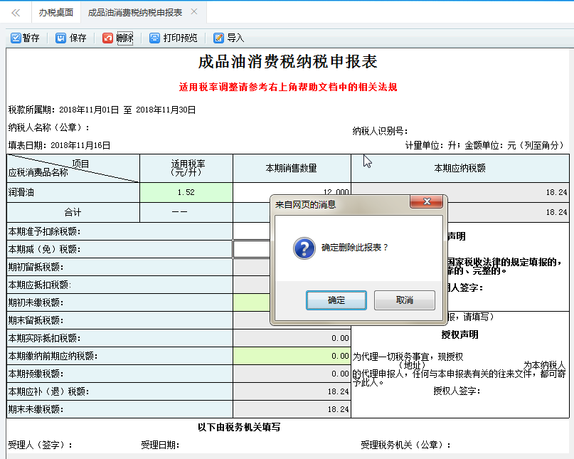 3.保存后如果發(fā)現(xiàn)數(shù)據(jù)有問題,可點擊【刪除】按鈕進(jìn)行刪除保存數(shù)據(jù),待頁面彈出提示框提示“確定刪除此報表?”,點擊【確定】按鈕,表單填寫的內(nèi)容被刪除:
