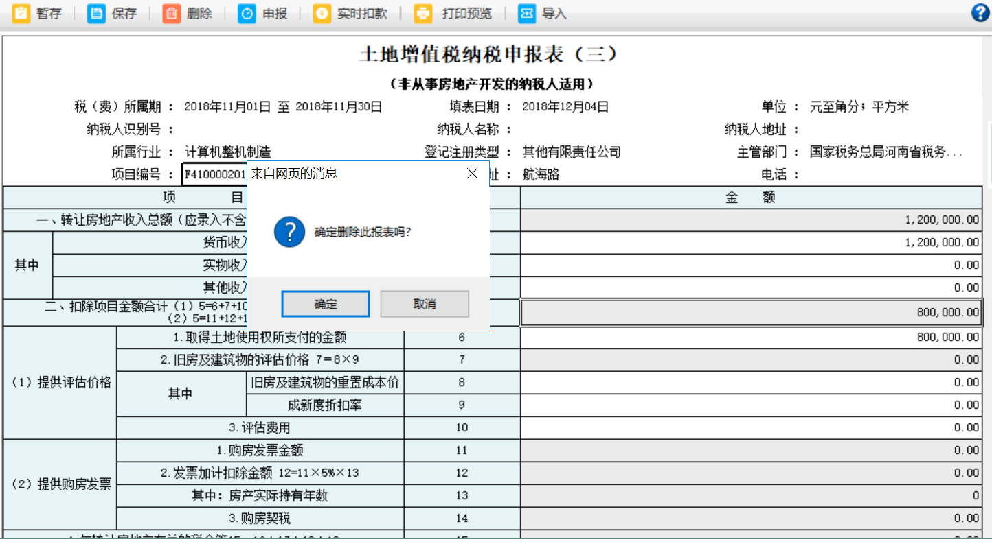 3.保存后如果發(fā)現(xiàn)數(shù)據(jù)有問題,可點(diǎn)擊【刪除】按鈕進(jìn)行刪除保存數(shù)據(jù),待頁面彈出提示框提示“確定刪除此報表嗎?”,點(diǎn)擊【確定】按鈕,表單填寫的內(nèi)容被刪除:
