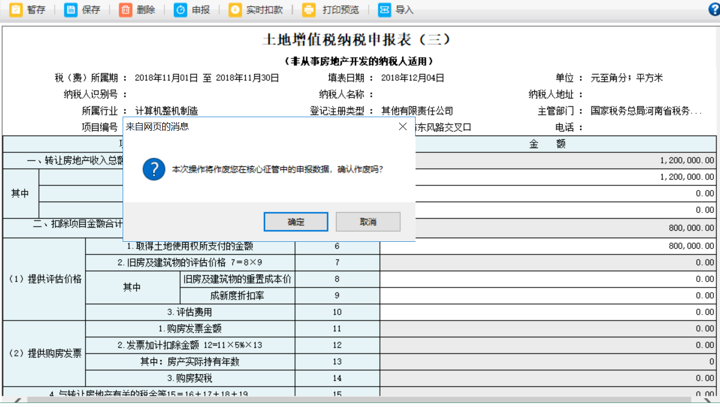 5.申報后如果發(fā)現(xiàn)數(shù)據(jù)有問題,勾選當(dāng)期以申報土地增值稅信息中的申報信息,點(diǎn)擊【刪除】按鈕進(jìn)行刪除申報記錄,待頁面彈出提示框提示“本次操作將作廢您在核心征管中的申報數(shù)據(jù),確認(rèn)作廢嗎?”,點(diǎn)擊【確定】按鈕,申報記錄被刪除: