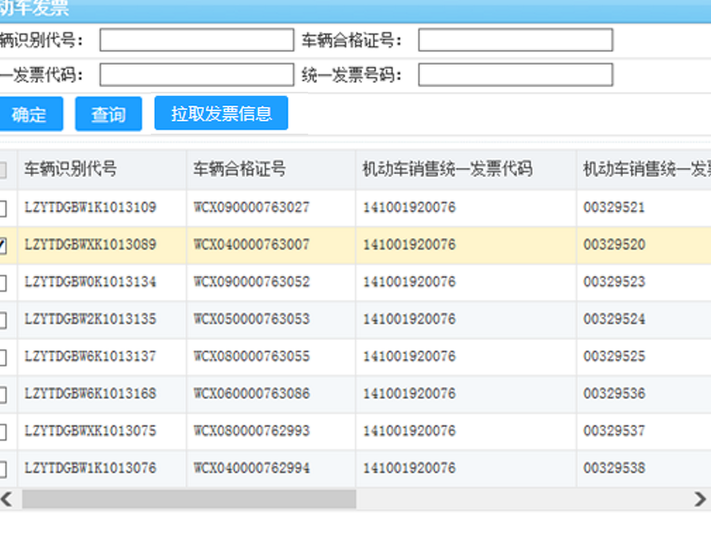 3.在車購稅發(fā)票頁面,可以選擇要進(jìn)行申報的車購稅發(fā)票信息,發(fā)票信息若過多,可以通過查詢條件:車輛識別代號、車輛合格證號、統(tǒng)一發(fā)票代碼、統(tǒng)一發(fā)票號碼進(jìn)行查詢要申報的發(fā)票信息。如下圖是所示:
