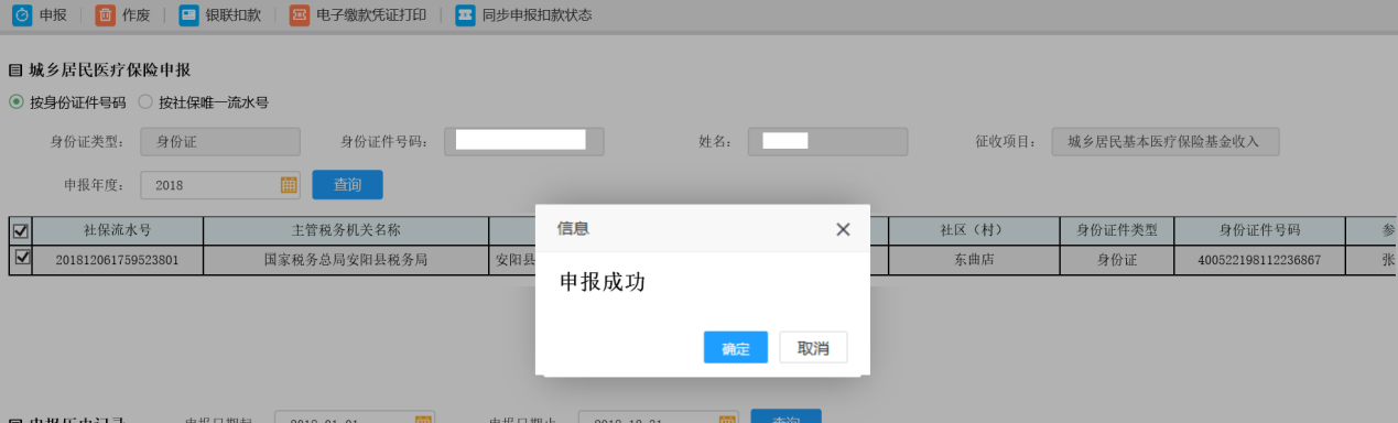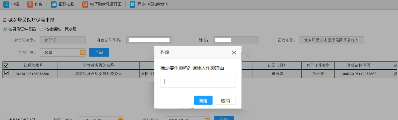 5.申報后如果發(fā)現(xiàn)數(shù)據(jù)有問題,可點擊【刪除】按鈕進(jìn)行刪除此次的申報記錄,待頁面彈出提示框提示“本次操作將作廢您在核心征管中的申報數(shù)據(jù),確認(rèn)作廢嗎?”,點擊【確定】按鈕,申報記錄被刪除: