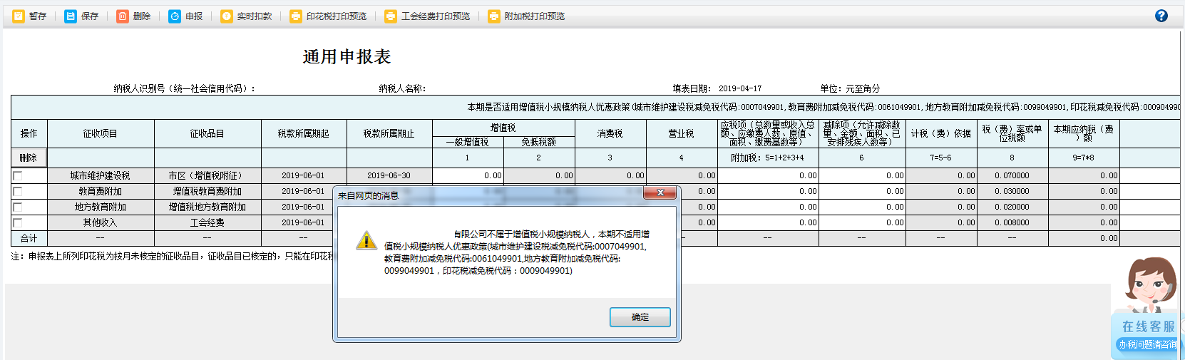 2.如果納稅人在核心征管中認(rèn)定的不同主稅(增值稅,消費稅,營業(yè)稅)的納稅期限不一致,不同附加稅(城市維護(hù)建設(shè)稅,教育費附加,地方教育費附加)的納稅期限不一致,或主稅與附加稅的納稅期限不一致,則不允許申報(即實際附加稅申報時,以附加稅所認(rèn)定的納稅期限為準(zhǔn)即可,不同附加稅的納稅期限不一致時提示不允許申報);