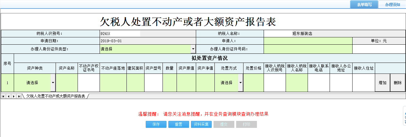 1.打開【欠稅人處置不動產或者大額資產報告表】,填寫表單: