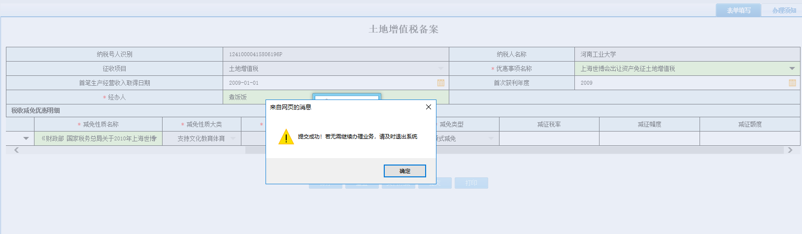 2.點擊【保存】按鈕,待頁面彈出提示框提示“保存成功!”,點擊【確定】按鈕,表單填寫的內(nèi)容被保存。