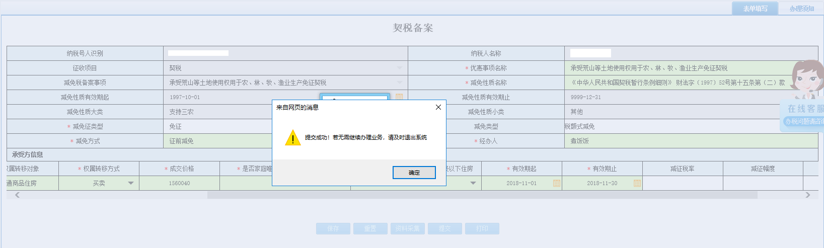 4.若該業(yè)務(wù)沒(méi)有需要上傳的資料,可點(diǎn)擊【返回至表單】,頁(yè)面跳轉(zhuǎn)至表單頁(yè)面;確認(rèn)填寫(xiě)無(wú)誤后,點(diǎn)擊【提交】按鈕,待頁(yè)面提示“提交成功!若無(wú)需繼續(xù)辦理業(yè)務(wù),請(qǐng)及時(shí)退出系統(tǒng)!”后,點(diǎn)擊【確定】,頁(yè)面跳轉(zhuǎn)至辦稅進(jìn)度及結(jié)果信息查詢(xún):