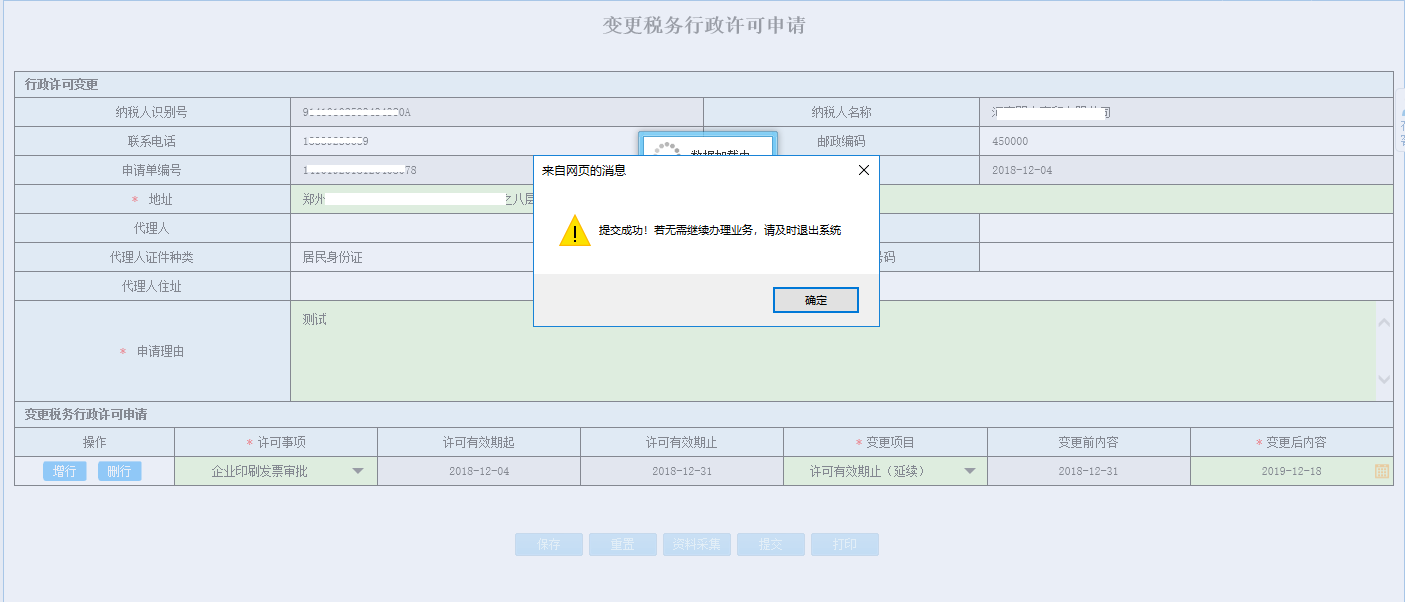4.點(diǎn)擊【返回至表單】,頁面跳轉(zhuǎn)至表單頁面;確認(rèn)填寫無誤后,點(diǎn)擊【提交】按鈕,待頁面提示“提交成功!若無需繼續(xù)辦理業(yè)務(wù),請(qǐng)及時(shí)退出系統(tǒng)!”后,點(diǎn)擊【確定】,頁面跳轉(zhuǎn)至辦稅進(jìn)度及結(jié)果信息查詢: