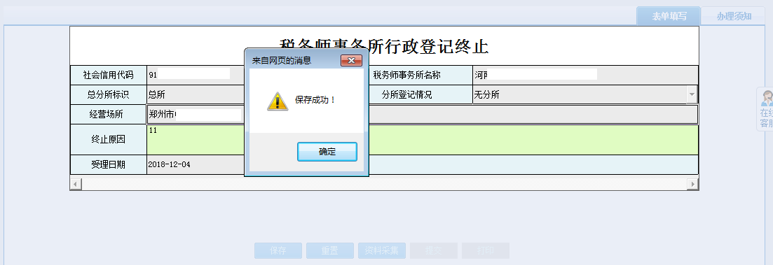 2.點擊【保存】按鈕,待頁面彈出提示框提示“保存成功!”,點擊【確定】按鈕,表單填寫的內容被保存。