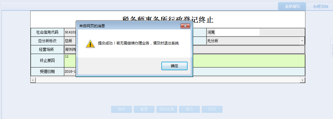 3.若該業(yè)務沒有需要上傳的資料,確認填寫無誤后,點擊【提交】按鈕,待頁面提示“提交成功!若無需繼續(xù)辦理業(yè)務,請及時退出系統(tǒng)!”后,點擊【確定】,頁面跳轉至辦稅進度及結果信息查詢: