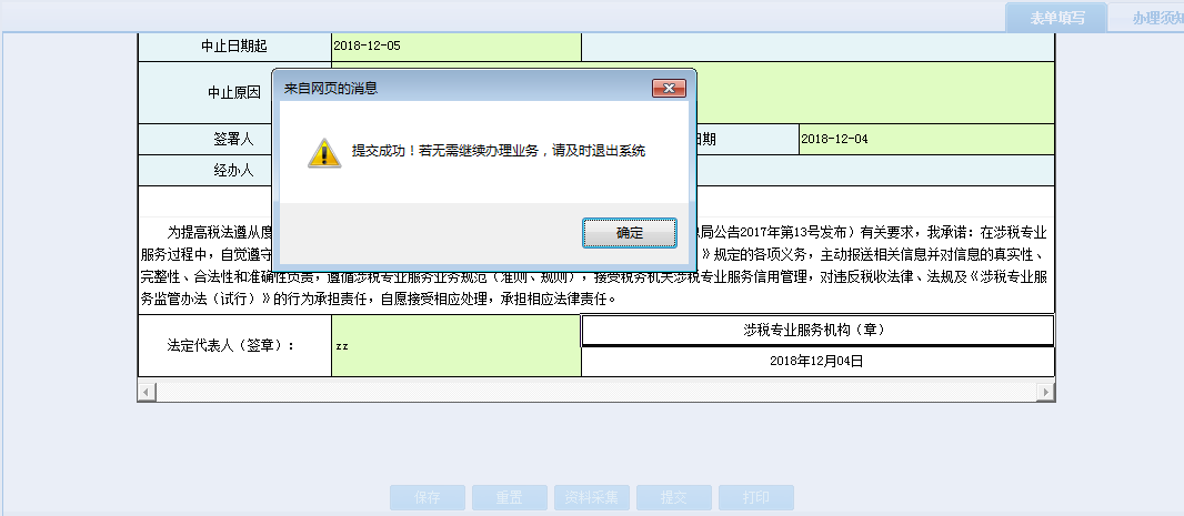 3.若該業(yè)務(wù)沒有需要上傳的資料,確認填寫無誤后,點擊【提交】按鈕,待頁面提示“提交成功!若無需繼續(xù)辦理業(yè)務(wù),請及時退出系統(tǒng)!”后,點擊【確定】,頁面跳轉(zhuǎn)至辦稅進度及結(jié)果信息查詢: