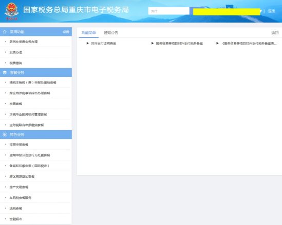 登陸重慶市電子稅務(wù)局后,可通過以下兩種方式進(jìn)入“服務(wù)貿(mào)易等項目對外支付稅務(wù)備案”模塊